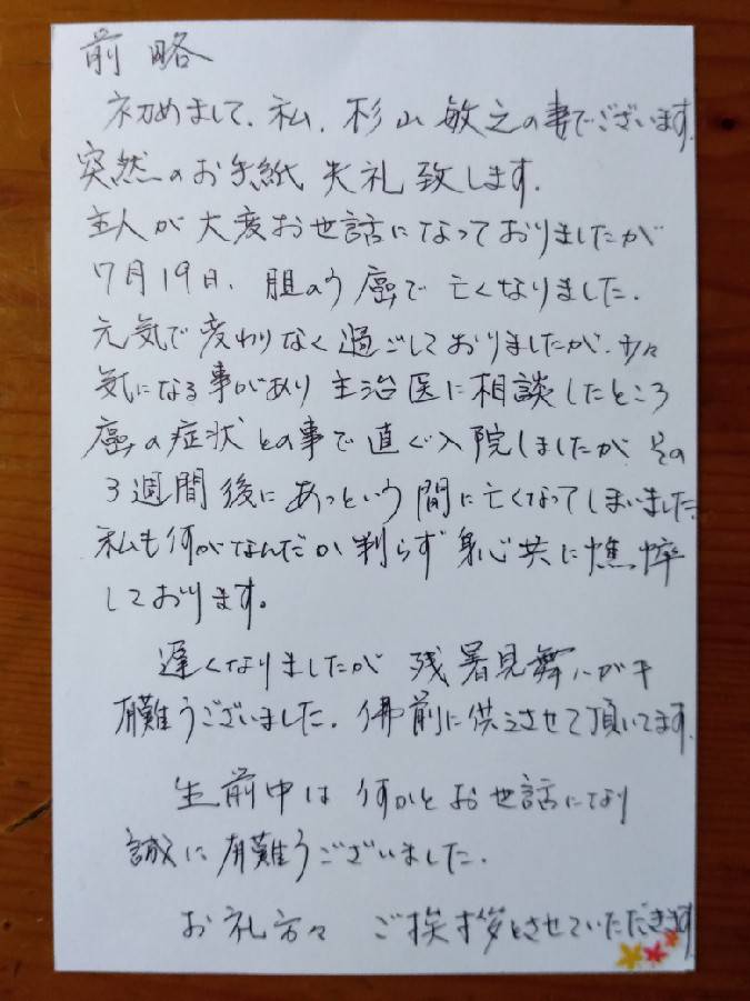今日、杉山さんの奥様から手紙が届きました。
